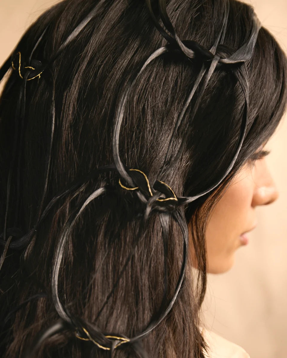 Drawing inspiration from Saksi's ornate tapestry depicting the Norse goddess of golden hair, Oribe Principal Artist, Nicci Welsh, designed exclusive looks for our Holiday campaign featuring golden thread woven into the hair using intricate braiding techniques.