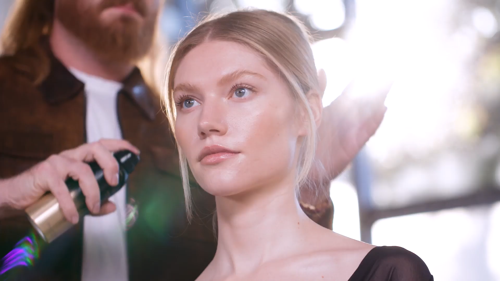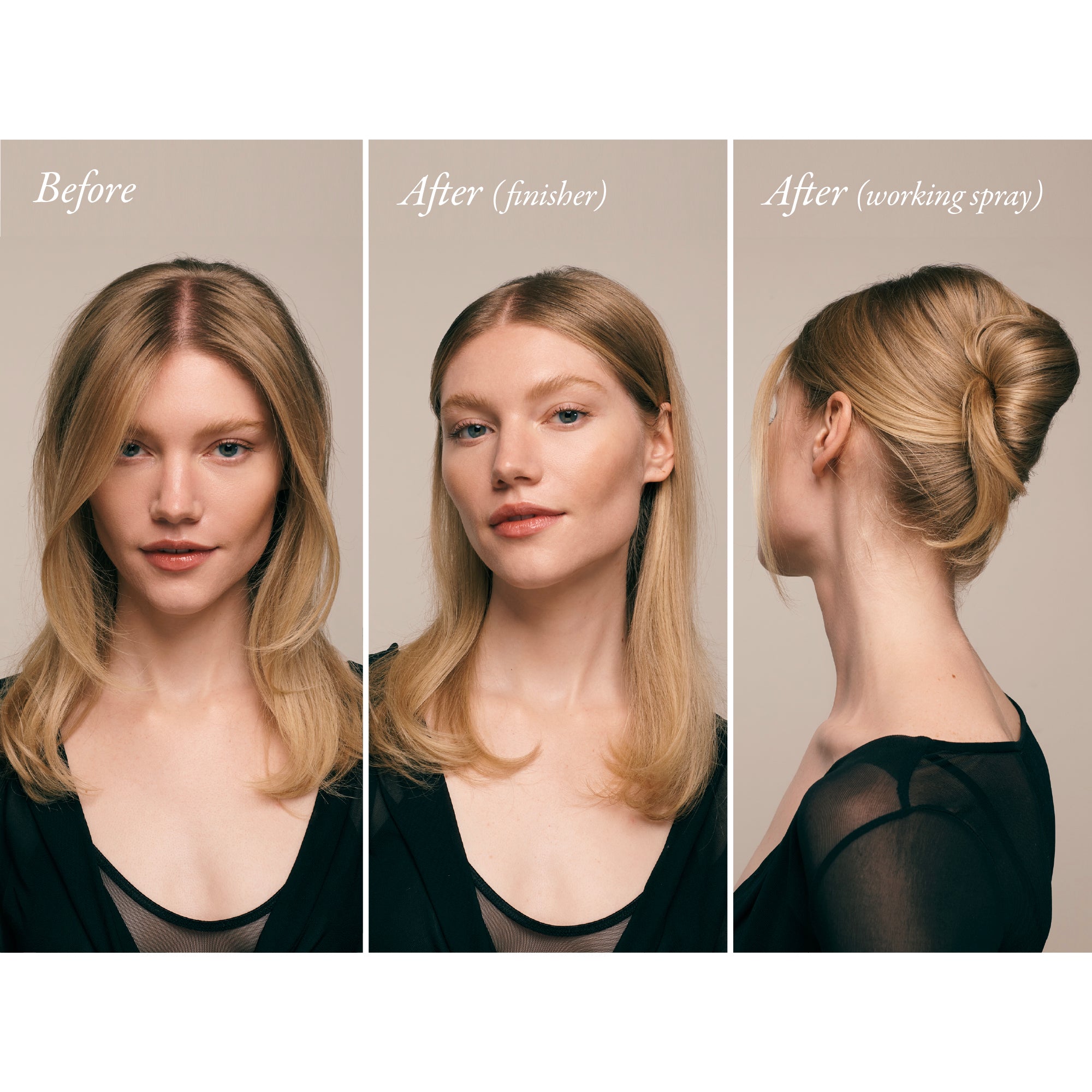 Auf die fertige Frisur sprühen, um Frizz zu vermeiden, die Frisur setzen und Struktur hinzufügen.